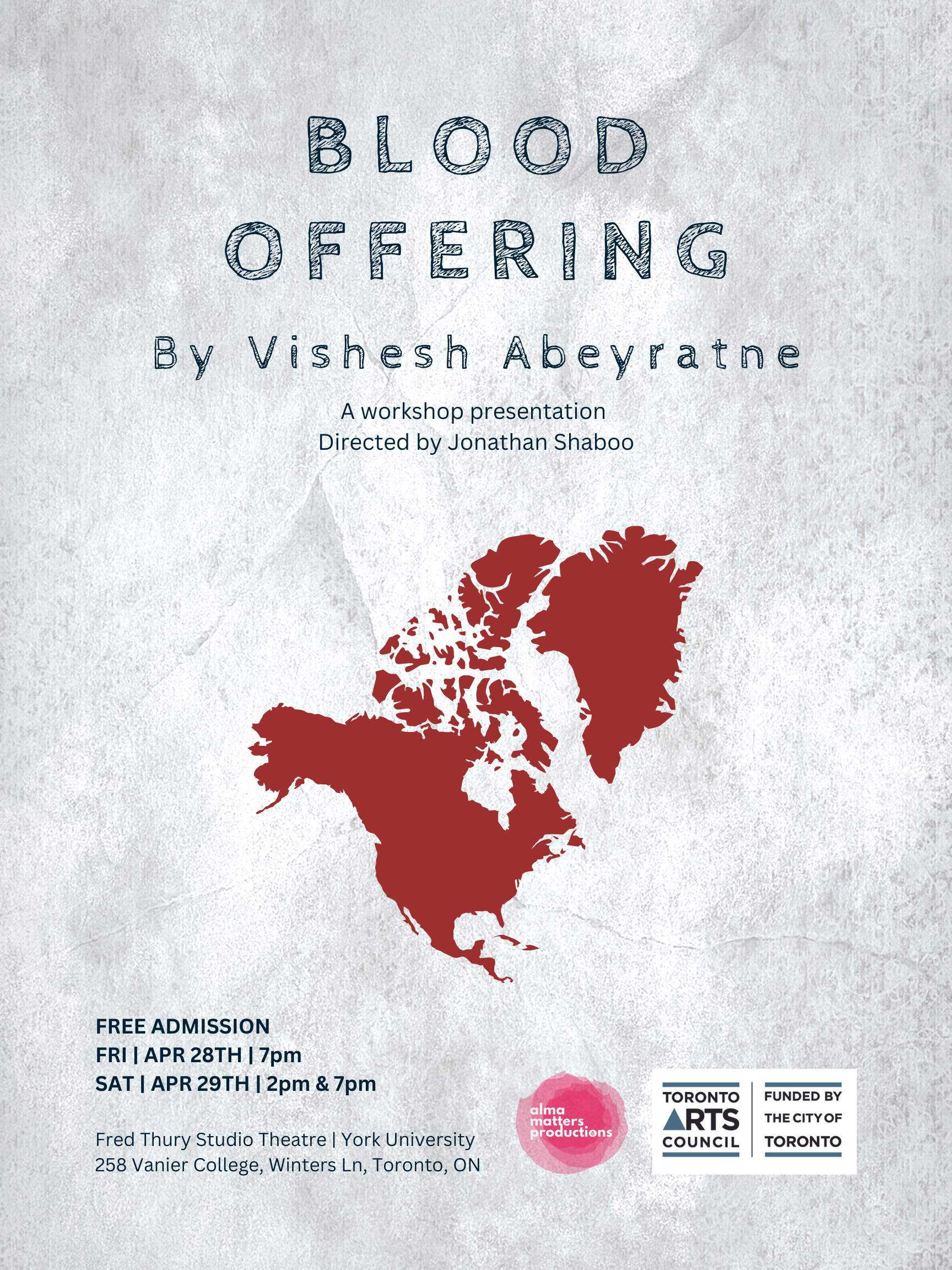 Blood Offering was workshopped at York University’s Fred Thury Studio Theatre.