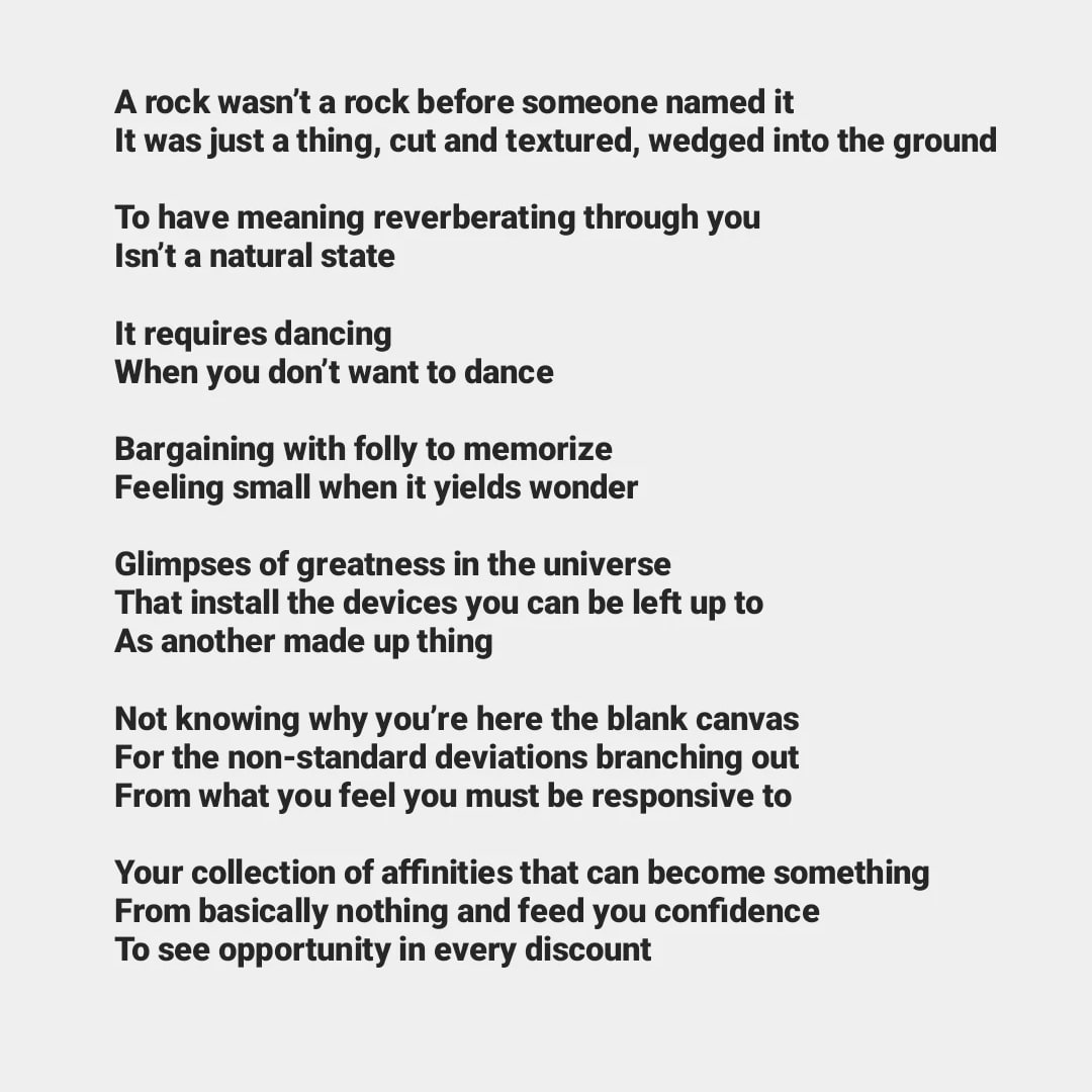 Sometime in late 2019, I remembered and began executing the following process from the 270-or-so-page document: pick 3-5 passages at random, running the cursor randomly up and down after each selection, and make a new poem out of them. Nineteen of them now reside in your hands.